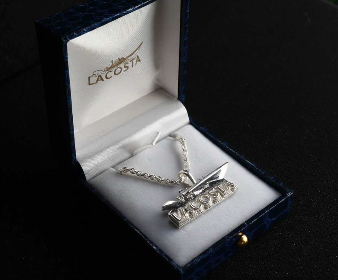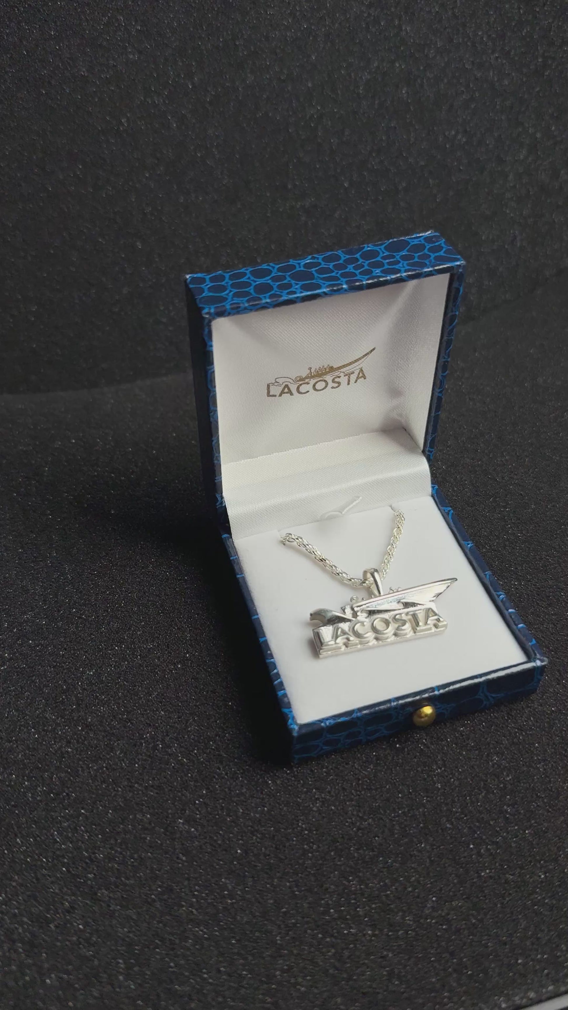 Colgante de Lacosta fabricado en plata de 1ra ley 925. Cadena cordón de 2 milímetros de 50 cm de largo fabricado en plata de 1ra ley 925. Ambos productos bañados en oro blanco y pasivados para proteger la oxidación de la plata